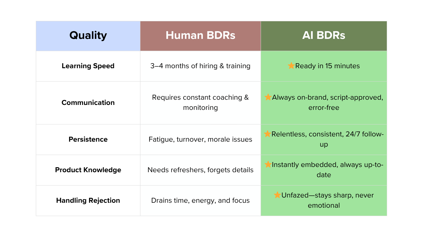 AI BDRs are a fraction of the cost with no recruiting, training, or turnover.